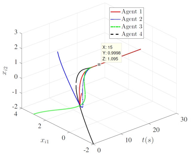 其中k1,k2,α,β,Q>0,且收敛时间界是一个由这些参数组成的复杂分式。因此,分布式优化算法中将不可避免的引入基于状态的分数阶项。针对相对阶为2的受控系统,在滑模控制框架下,上述方法可能会导致优化算法出现奇异性;同时上述不等式条件会被重复使用,这会增加在收敛性分析和控制设计上的复杂度。