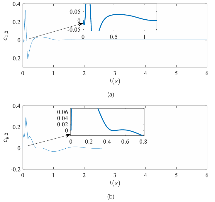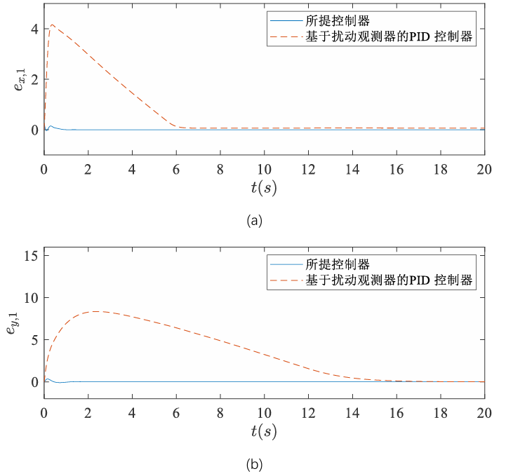 图4 所提控制器与基于扰动观测器的PID控制器的间距误差对比:(a) 纵向间距误差 (b) 横向间距误差